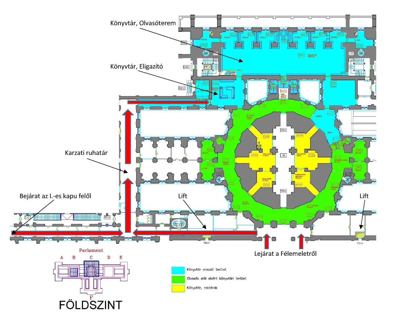 A Parlament épületéből a földszinti folyosón a „Karzatlátogatás” felé elindulva a folyosó végén jobbra kell fordulni.