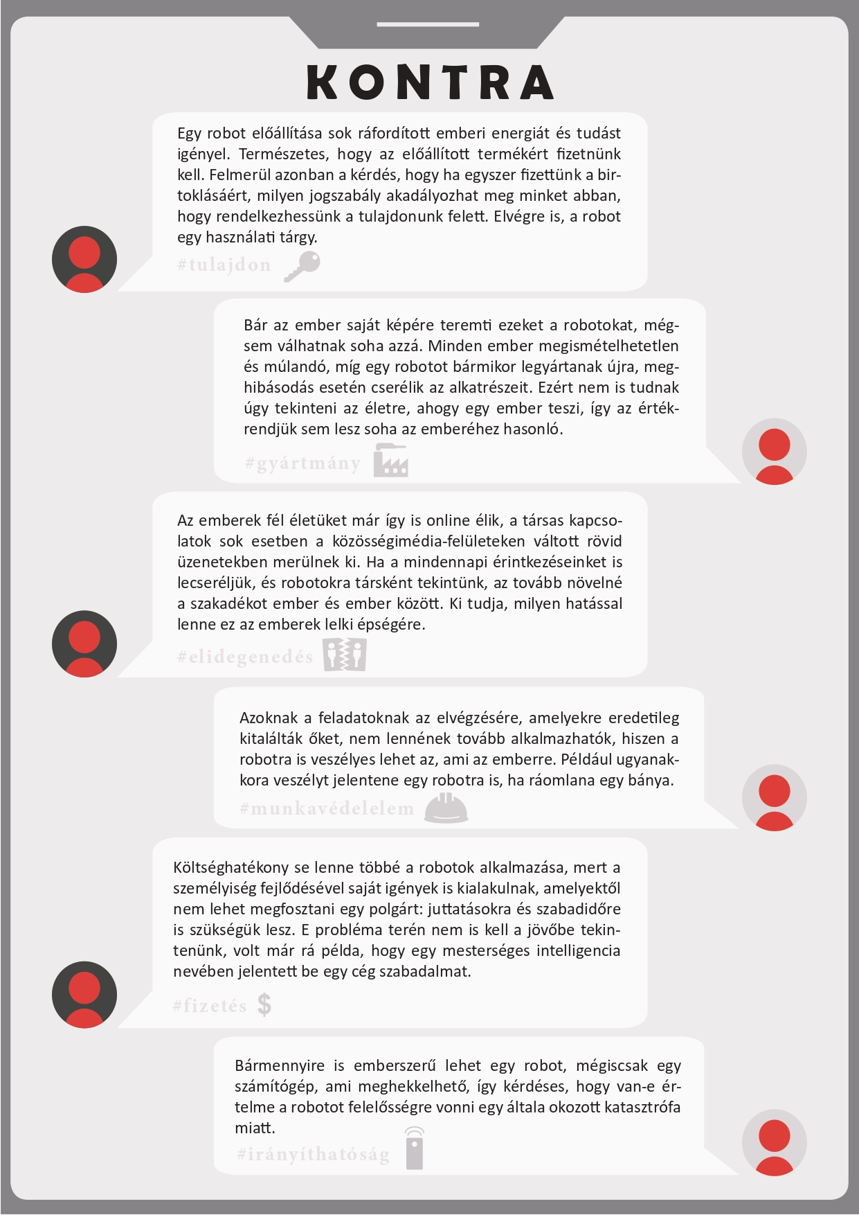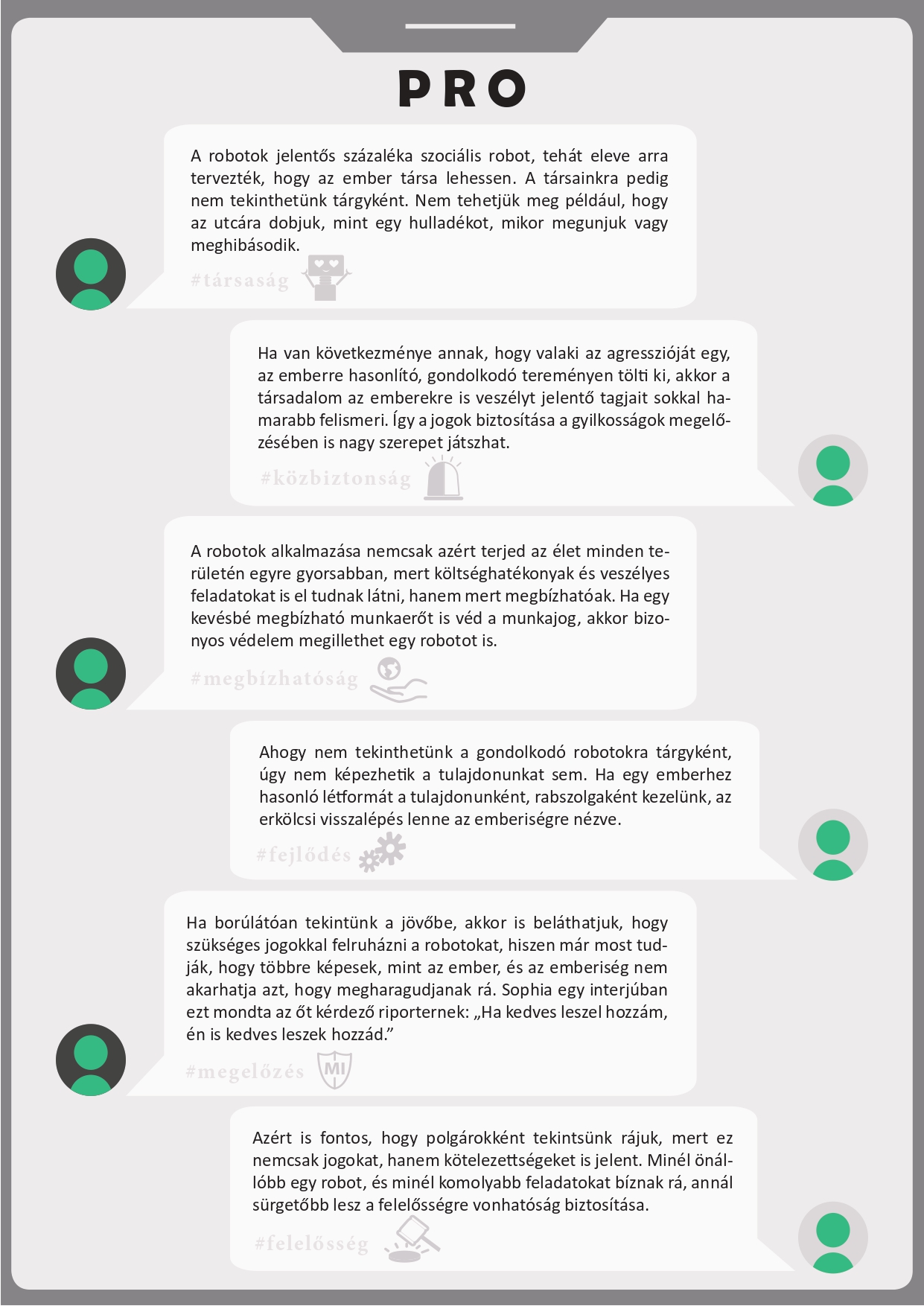 Pro és kontra érveket tartalmazó tablók A tablók az álláspontok kialakításában nyújtanak segítséget: a mellett és az ellen sorakoztatnak fel érveket, hogy a mesterséges intelligenciával rendelkező humanoid robotokat megilletik-e az emberi jogok. Letöltésükhöz kattintson a képekre! |