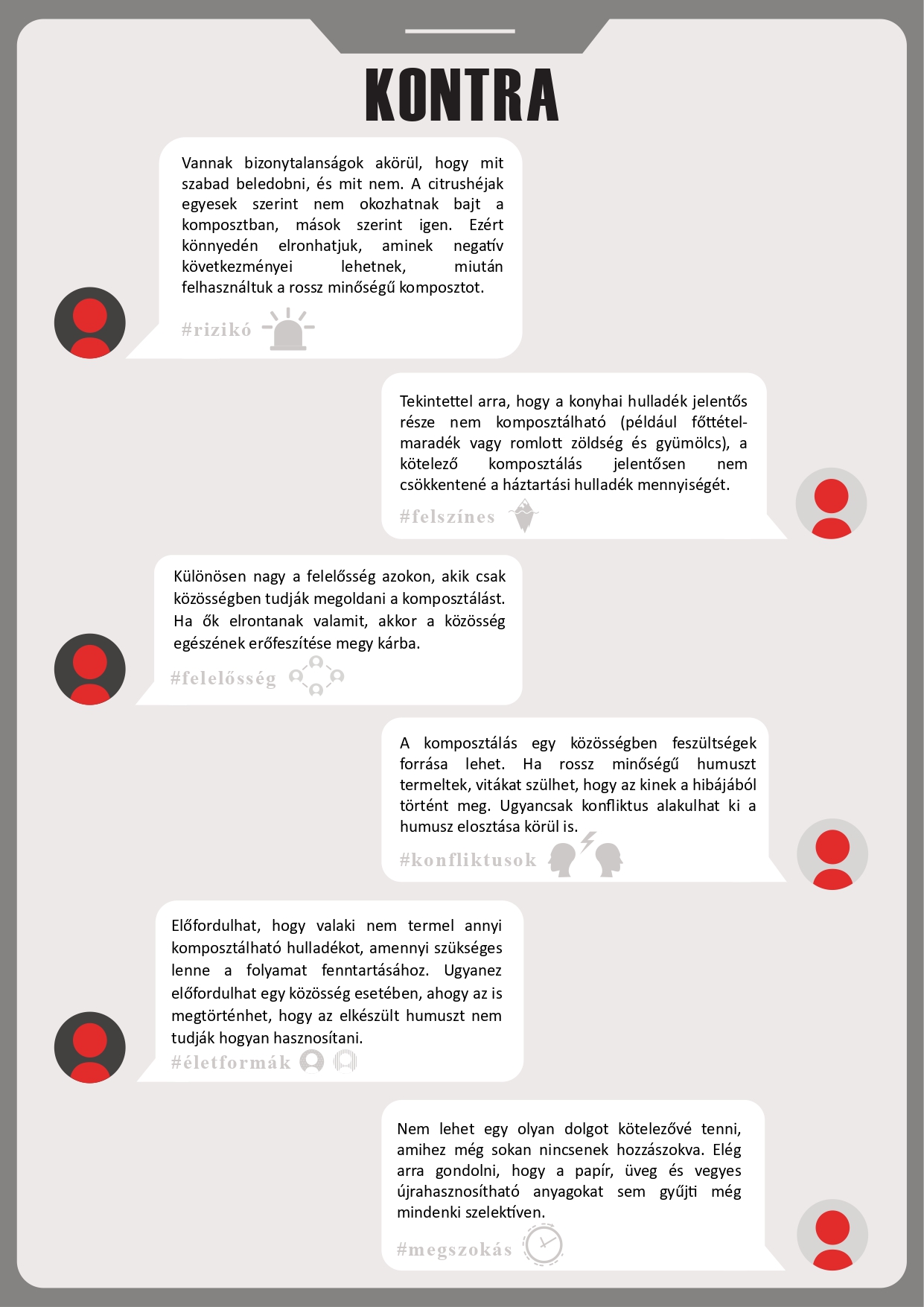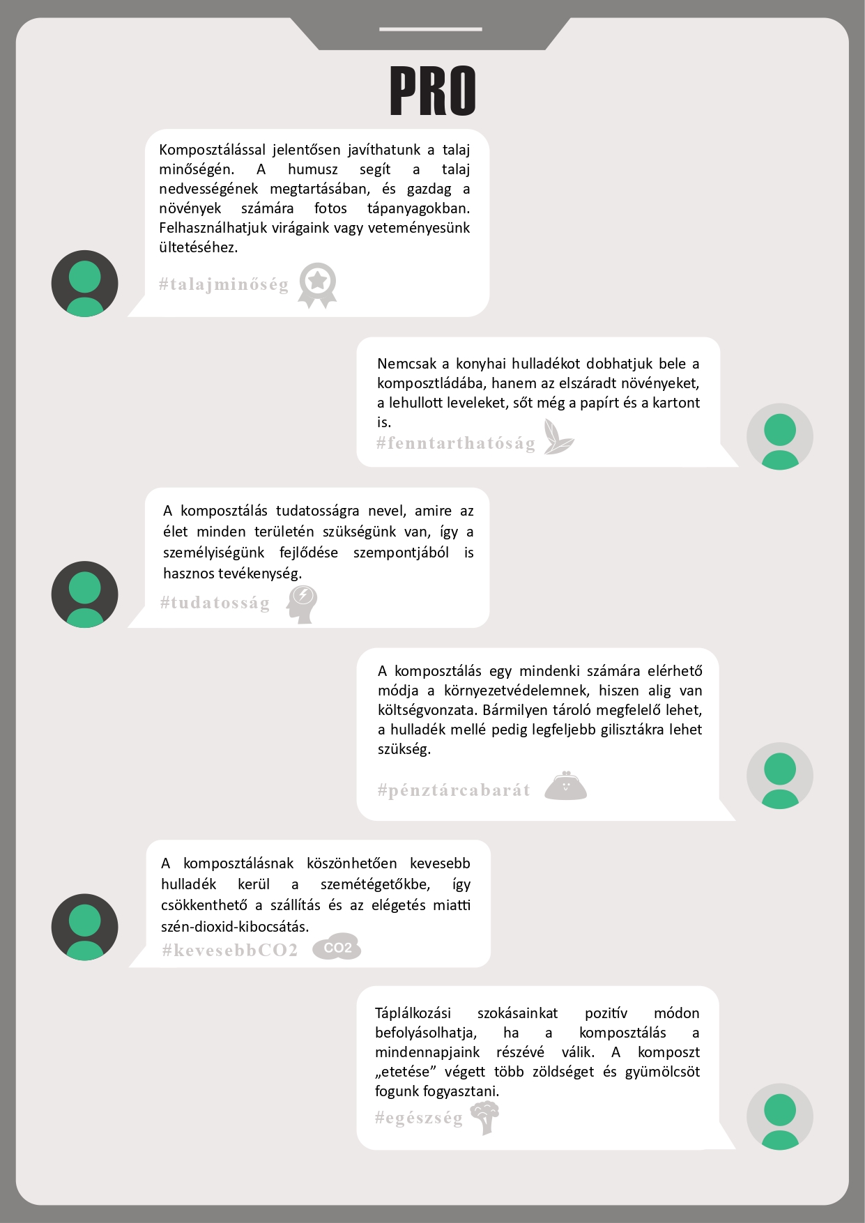Pro és kontra érveket tartalmazó tablók A tablók az álláspontok kialakításában nyújtanak segítséget: a mellett és az ellen sorakoztatnak fel érveket, hogy a érdemes lenne-e kötelezővé tenni a komposztálást. Letöltésükhöz kattintson a képekre! |