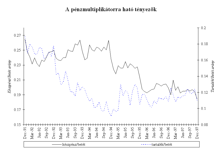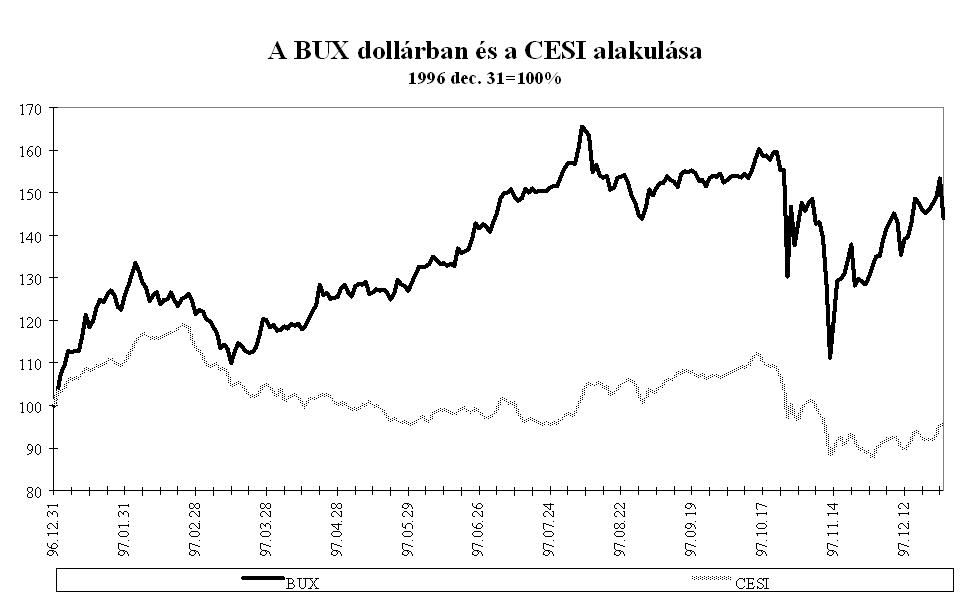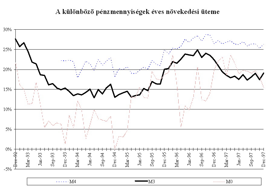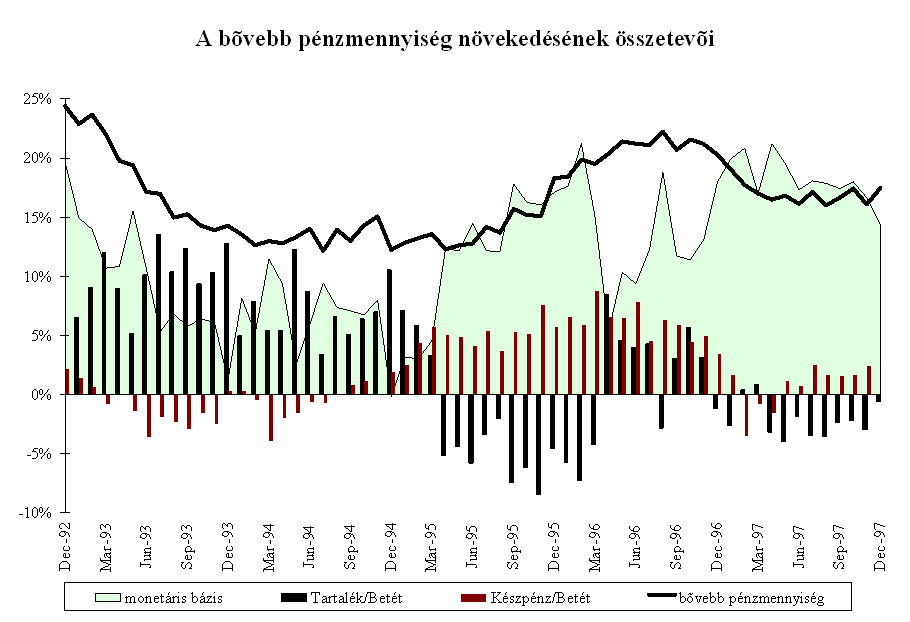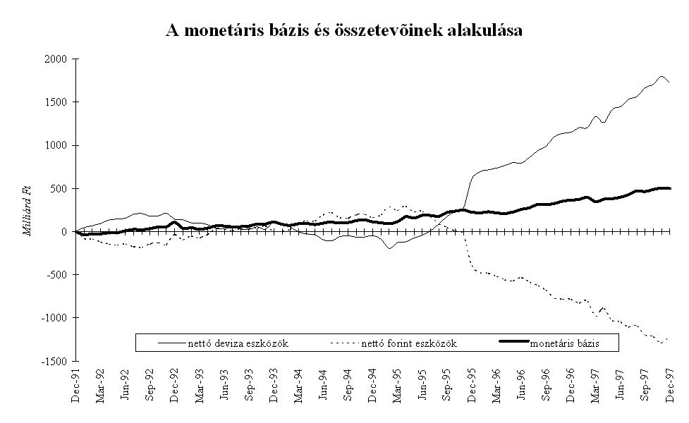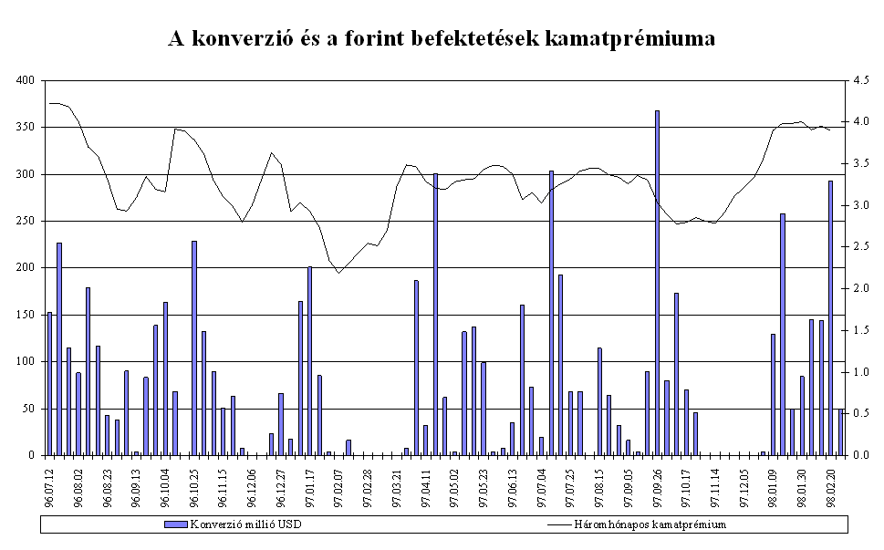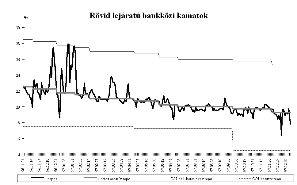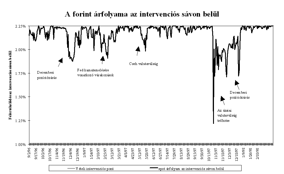 A forint piaci árfolyama az év során a kijelölt pályának megfelelően alakult. A középárfolyamhoz viszonyítva a forint mindvégig felülértékelt volt, többször is elérte az intervenciós sáv vételi határát, az MNB az év során összesen 3,5 Md USD értékben vásárolt devizát. Az elmúlt évben három olyan időszak volt, amikor az árfolyam hosszabb időszakra elszakadt a sáv erős szélétől, és a szokásosnál nagyobb volatilitást mutatott. Az árfolyam átmeneti leértékelődésének hátterében nem fundamentális okok, hanem a nemzetközi befektetők hangulatának átmeneti változása állt. Február- márciusban a FED márciusi 25-i kamatdöntését megelőző várakozások csökkentették a magyar befektetések relatív hozamát, ami a magyar tőzsdei árfolyamok átmeneti csökkenésében is tükröződött. Ennek hatására az árfolyam 30-50 ponttal szakadt el az intervenciós sáv tetejétől. Ebben az időszakban a Postabank körül kialakult bizonytalanság szintén hozzájárulhatott a forint átmeneti leértékelődéséhez. Május közepén a thai valutaválság kibontakozása és a cseh korona válsága ingatta meg a külföldi befektetők bizalmát a közép-európai valutákban. Ekkor a forint két hétre gyengült meg, az árfolyam 25 ponttal szakadt el a sáv erős szélétől.