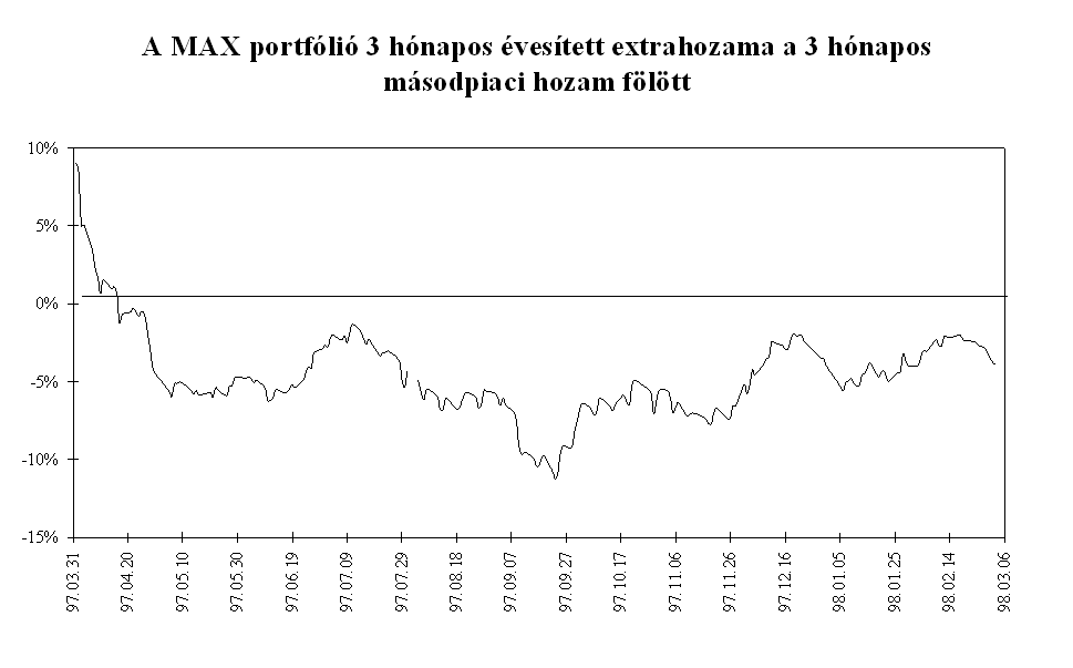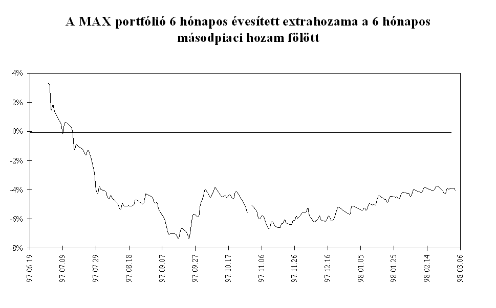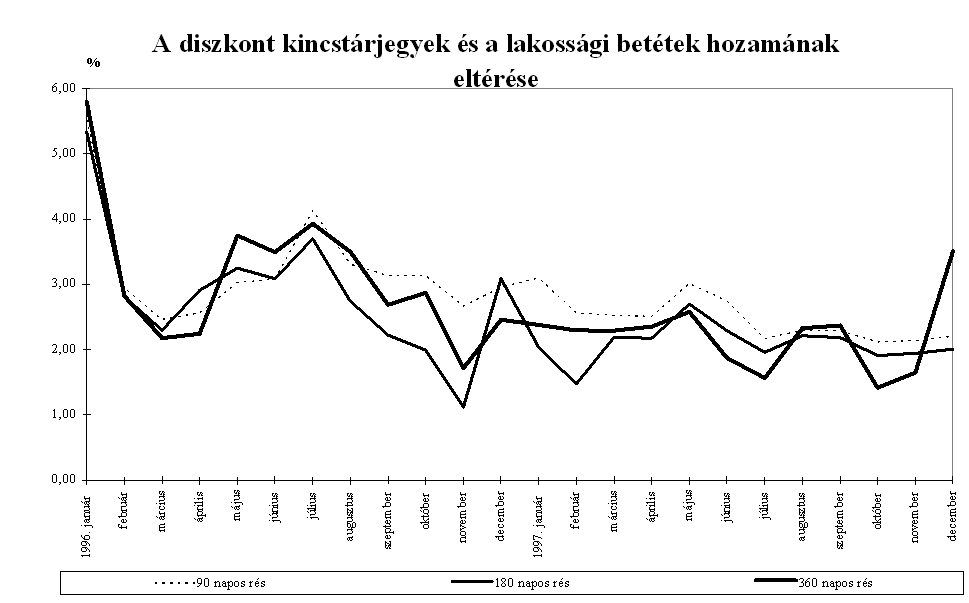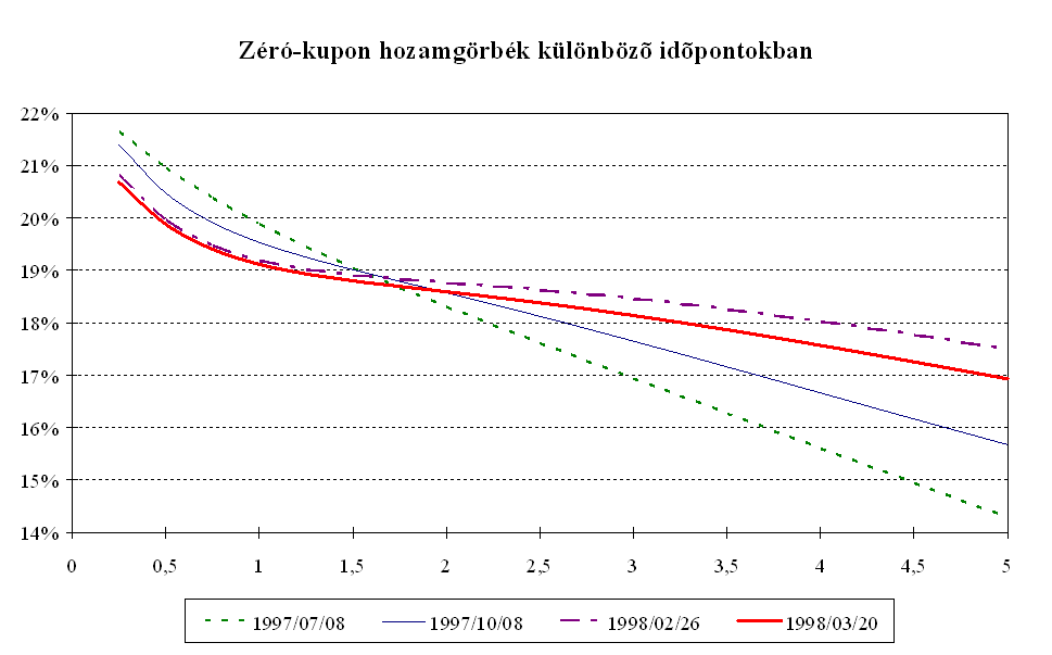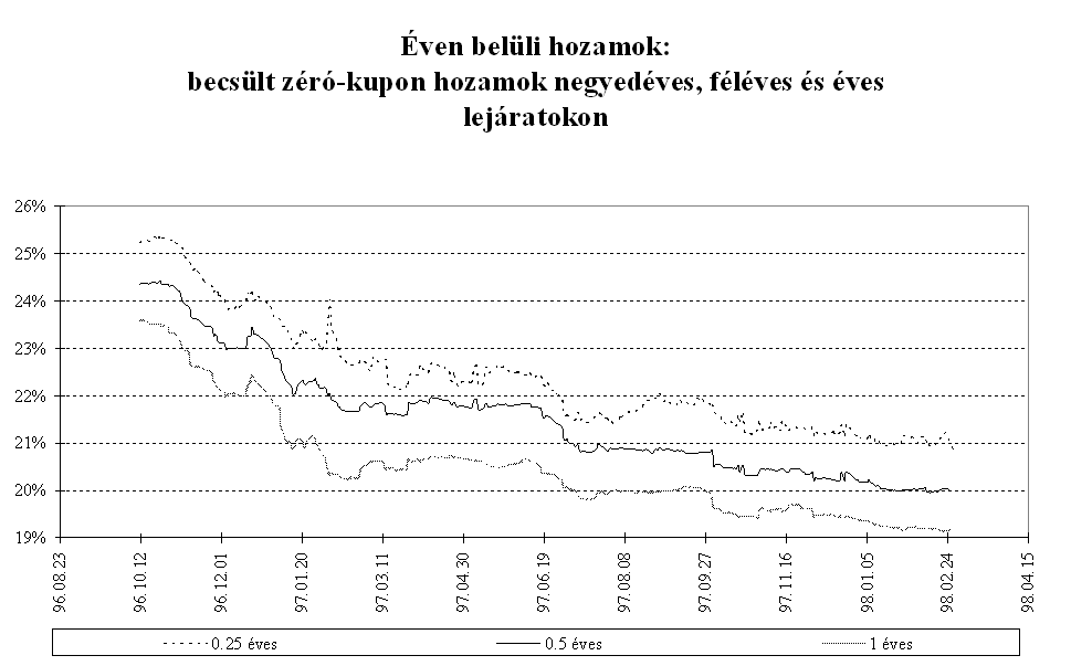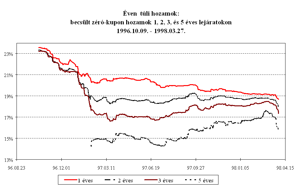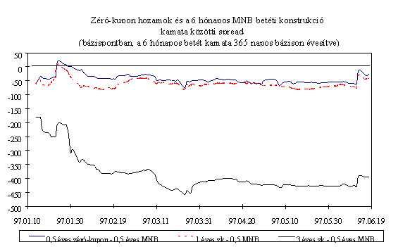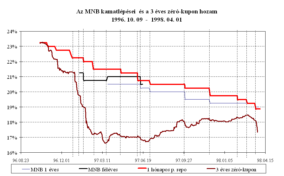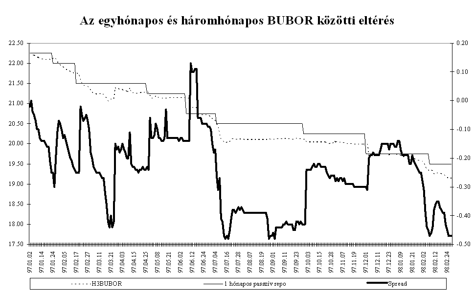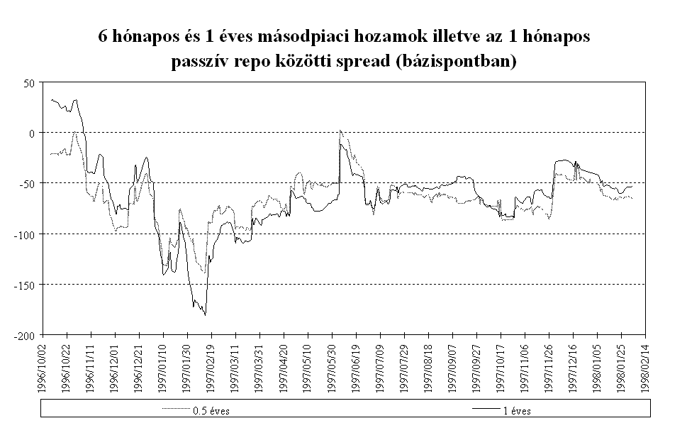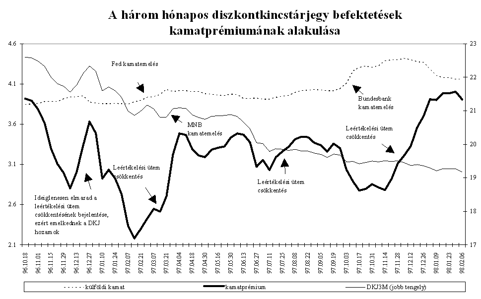Mindezen intézkedések eredményeként az MNB március elejére megállította a rövid lejáratú pénzpiaci eszközök kamatprémiumának 1996 októberében megkezdődött jelentős, a fundamentumokkal csak részben alátámasztott csökkenését. A másodlagos állampapírpiacon a három hónapos diszkont kincstárjegy hozamokat a hasonló lejáratú, kosárszerkezettel súlyozott Libor kamatokkal összehasonlítva, a magyar papír hozamelőnye áprilistól 250-350 bázispont között ingadozott, majd az év végére 350-400 bázispont közé emelkedett. A kamatprémium év során tapasztalt volatilitását elsősorban az okozta, hogy a leértékelési ütemcsökkentés többnyire már a kihirdetés előtt beépült a piaci szereplők várakozásaiba. A kosárvalutákat jegyző országok jegybankjai kétszer változtattak irányadó kamatlábaikon. A FED márciusi 25-i kamatemelése időben egybeesett az MNB hathónapos betét kamatának emelésével, és a szintén kamatnövelő hatású éves betét konstrukció meghirdetésével. A Bundesbank október 14-i kamatemelésére nem reagált a magyar jegybank, mivel a kamatok alakulását összhangban állónak értékelte a leértékelési ütem küszöbön álló csökkentésével. Ez a kamatprémium átmeneti csökkenését eredményezte. Az ázsiai válság kirobbanása után az MNB szükségesnek tartotta a forintbefektetések kamatprémiumának növelését. A leértékelési ütem csökkentésének bejelentése ellenére az MNB decemberben a repo kamatok változatlanul hagyása mellett az éves kötvény kamatát 25 bázisponttal csökkentette. Ennek eredményeként a három hónapos kamatprémium közel 100 bázispontot emelkedett. A pénzügyi befektetők feltörekvő országokkal szembeni bizalmának megrendülése miatt januárig a magasabb prémium sem indukált konverziót. A forintbefektetések iránti bizalom helyreállását azonban jelzi, hogy az őszi általános bizonytalanság után januártól ismét intenzíven interveniál a jegybank az árfolyamsáv erős szélén.