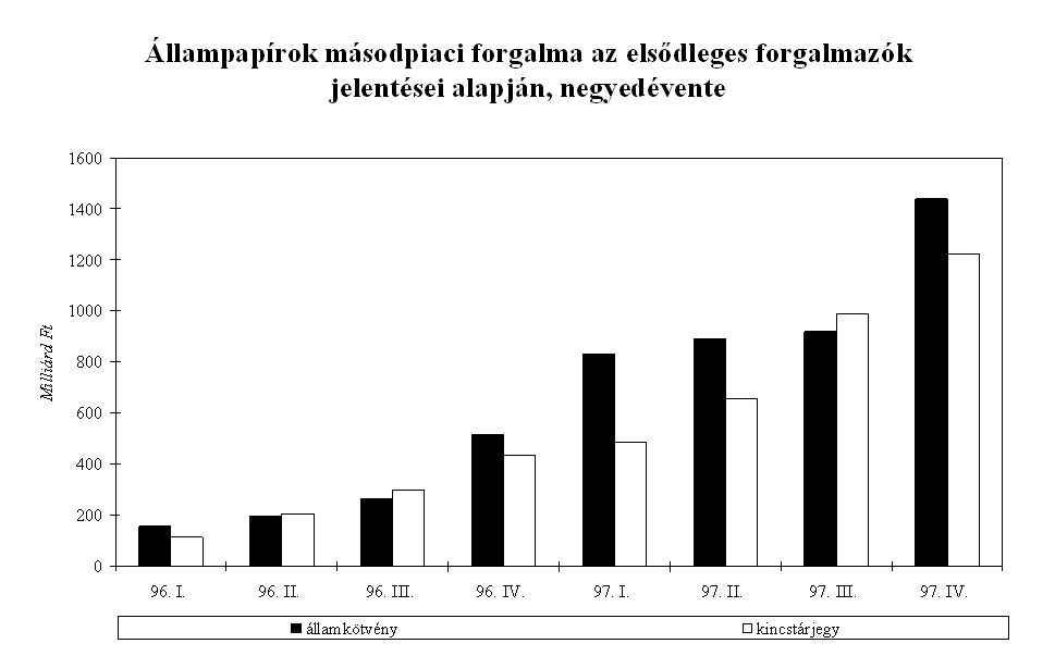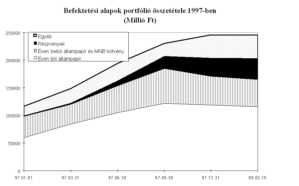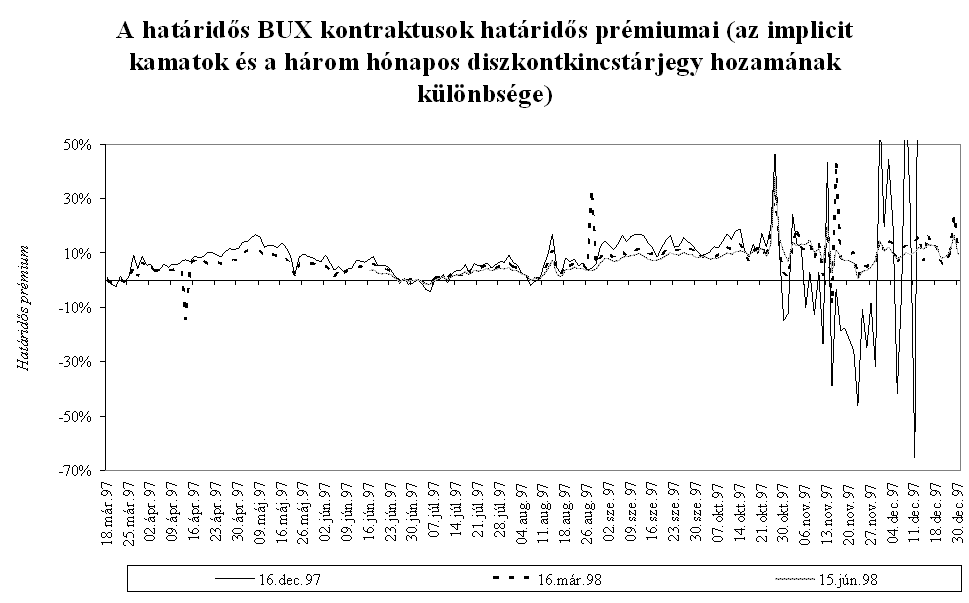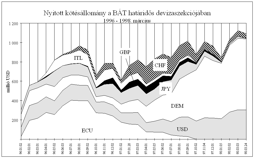 a típusú ügylet háttérbe szorult, és a főbb nemzetközi devizák keresztárfolyam-változásaira történő spekuláció - a japán jen és svájci frank gyengülésére, illetve az angol font erősödésére - került előtérbe. Ez a tendencia 1997 első négy hónapjában is folytatódott, amely a nyitott kötésállomány alakulásában is megmutatkozott. A nyitott kötésállományon belül a kosárdevizákon (DEM, ECU, USD) kívüli többi deviza részesedése 1997 áprilisára 55 százalékra emelkedett. A határidős árfolyamok kamattartalmainak vizsgálata alapján az év első hónapjaiban az amerikai dollár esetén is határidős vétel volt a jellemző, azaz a dollár erősödésében bíztak a tőzsdén spekulálók, és a dollárüzletek jelentős részét nem fedezetlen határidős kosáreladás céljából kötötték.