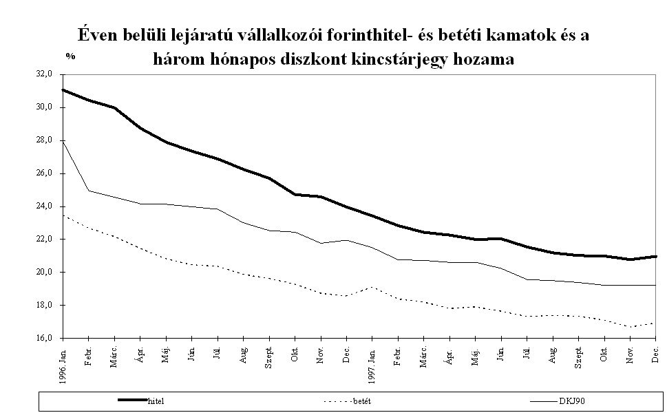 Az 1996. évi tendencia folytatásaként a kamatszint tovább csökkent, azonban a vállalati hitelkamatok csökkenése a betéti kamatok csökkenésénél gyorsabb volt. Emellett a kamatozó eszközök átlagos állományának növekedési üteme is elmaradt a kamatozó források növekedési ütemétől. E két tényező együttesen a spread további szűkülését eredményezte.