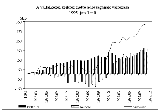 Reálisabb, és áttekinthetőbb képet ad a bankrendszer portfoliójáról, ha a minősített állományon belül külön kezeljük a mérlegen kívüli kötelezettségeket. A minősítendő hitelek és befektetések állománya 13,3%-kal emelkedett, így részaránya a minősítendő állományon belül 11%-kal csökkent. Ennél lényegesen nagyobb ütemben, 86%-kal nőtt a függő és jövőbeni kötelezettségek állománya, míg az e tételek fedezésére szolgáló céltartalék állománya alig 3%-kal haladta meg az 1996. évit. A céltartalékkal történő fedezettség így rendkívül alacsony, hiszen a mintegy 2.286 Md Ft nagyságrendű minősített állomány mögött összesen 10 Md Ft nagyságrendű, tehát 0,4%-ot kitevő céltartalék állomány állt. Az, hogy ennek nagysága elegendő-e a kockázatok fedezetére, a rendelkezésre álló információkból nem ítélhető meg, mivel a jövőbeni kötelezettségek nagy része mögött jelentős nagyságrendű ellentétes előjelű olyan ügyletek is állnak, melyek csökkentik e kihelyezések kockázatát.
