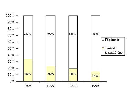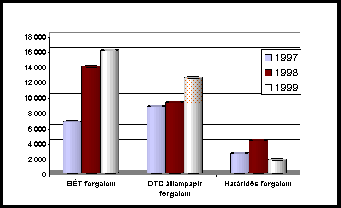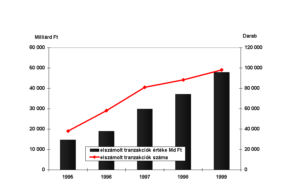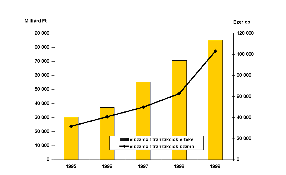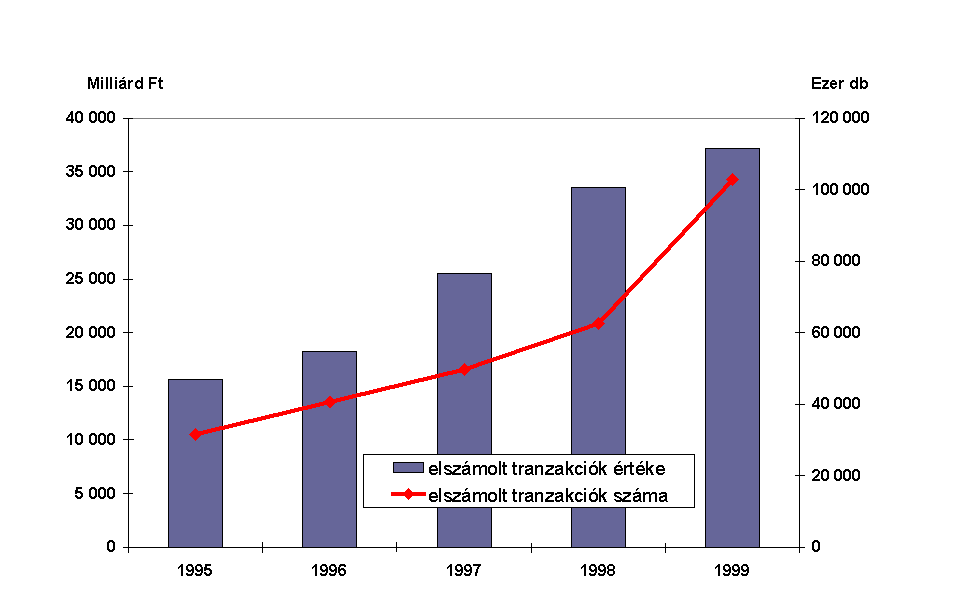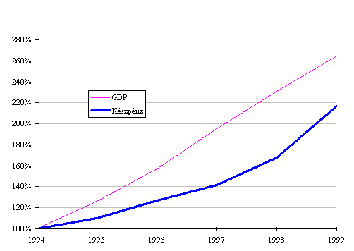 A forgalomban lévõ készpénz értékének növekedése hosszú évek óta elõször 1999-ben haladta meg a folyóáras GDP növekedési ütemét. (Ábra XIII-1) Igaz ez akkor is, ha az évszámváltással kapcsolatos év végi tartalékolást - amely a bankrendszerben a szokásosnál 60%-kal magasabb, megközelítõleg 110 milliárd forint készpénztartást eredményezett - figyelmen kívül hagyjuk.