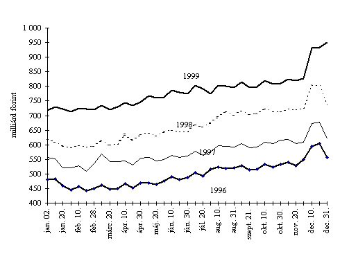 A forgalomban lévõ készpénz értékének évközi változása a korábbi évekéhez hasonló szezonalitást mutatott.(Ábra XIII-4) A készpénzállomány év végi növekedéséhez - a szezonálisnak megfelelõ december havi emelkedésen túl - hozzájárult az is, hogy a gazdálkodó szervezetek jelentõs része az év végi pénztári szünnapokat megelõzõen kifizette az egyébként január elsõ napjaiban esedékes béreket, valamint az, hogy a hitelintézetek és egyéb szervezetek az évszámváltással összefüggõ esetleges szokatlan mértékû pénzkereslet kielégítése érdekében az elõzõ évit jelentõsen meghaladó készpénzt tartottak pénztáraikban.