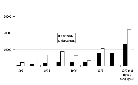Miközben az elõzõ év végéhez viszonyítva a forgalomban lévõ bankjegyek értéke 214,0 milliárd forinttal növekedett, darabszáma 2 millióval csökkent. A csökkenést egyrészt a százforintos bankjegyek bevonása, másrészt a régi típusú, a jegybank pénztáraiban törvényes fizetõeszközre be nem váltott ötezer- és ötszáz forintos bankjegyek jelentõs száma, harmadrészt a tízezer forintos részarányának további növekedése okozta.