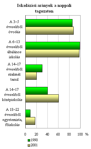 A közoktatásban a hetvenes években született viszonylag népes korosztályok 1978 és 1993 között vettek részt. A létszám az óvodákban 1980/1981-ben, az általános iskolákban 1986/1987-ben, a középfokú oktatásban 1992/1993-ban tetőzött, majd 1999/2000-ig fogyott. Az utóbbi években az óvodások és a középfokú képzésben részt vevők száma csekély mértékben nőtt. A 2001/2002. tanévben a közoktatás és felsőoktatás nappali tagozatára több mint 2 millió fiatal iratkozott be, a megfelelő korúak számának jelentős csökkenése ellenére csak 170 ezerrel kevesebb, mint 1989-ben.