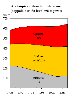 Kismértékű emelkedést az utolsó két év hozott, és 2001/2002-ben közel 130 ezren iratkoztak be ezekbe az intézményekbe. A középiskolai oktatáson belül a gimnáziumi képzés egyre népszerűbb. A nyolcvanas évek végén indult 8, illetve 6 osztályos gimnáziumi oktatás még nem vált általánossá. Ilyen típusú iskolába a gimnazisták kb. 16%-a járt. A fiatalok oktatásban való részvételének közel teljes körűvé válásával az esti és levelező oktatás szerepe az alapfokon veszített jelentőségéből, középfokon a kiegészítő képzés irányába tevődött át. E tagozatokon az alap- és középfokú oktatásban a hallgatók növekvő hányada fiatal. Az általános iskolai felnőttoktatásban részt vevők száma 2001/2002-re alig 3 ezer. A középiskolai szintű felnőttoktatásban lassuló ütemű, de folyamatos létszámnövekedés figyelhető meg, és jelenleg ilyen oktatásban valamivel több mint 90 ezren részesülnek.