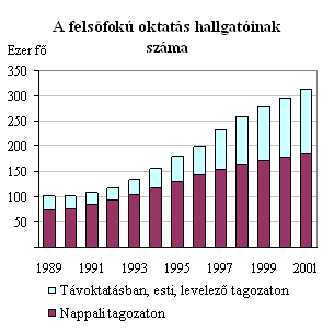 A felsőfokú továbbtanulás iránt élénkült az érdeklődés, 2001-ben több mint 84 ezren kérték felvételüket nappali tagozatra, ami 90%-kal magasabb az 1989. évinél. Ez idő alatt a felvettek száma közel háromszorosára emelkedett, ezen belül 2001-ben csaknem 10%-kal több hallgatót vettek fel, mint egy évvel korábban. A felvételi esélyek javulása ellenére is 2001-ben 35 ezer jelentkezőt utasítottak el.