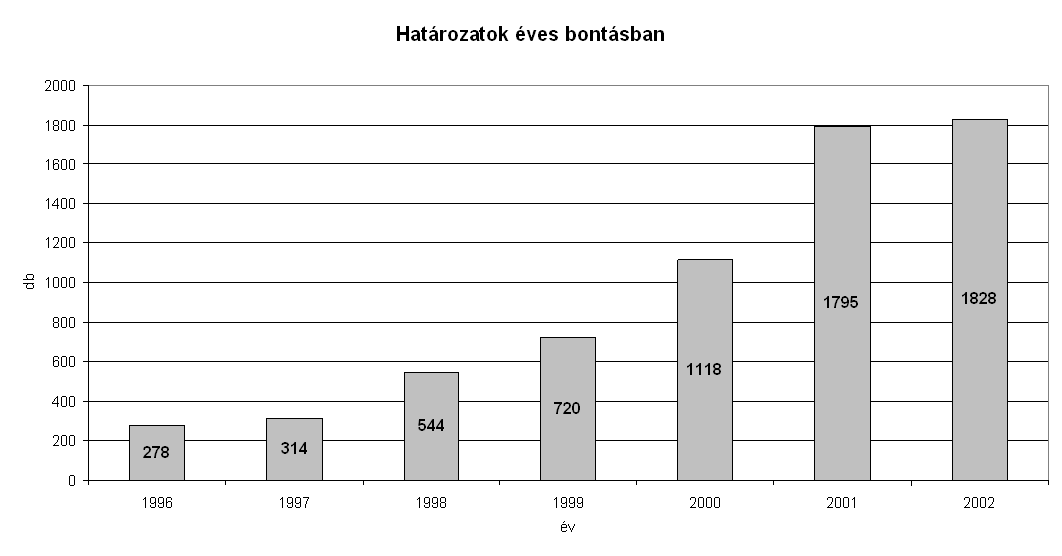 Az Országos Rádió és Televízió Testület által hozott határozatok, és azokat megalapozó előterjesztések száma 1996-tól 2001-ig, évről évre, mintegy 30%-os növekedést mutatott. Az elmúlt két évben azonban alig változott a határozatok száma. 2002-ben 1828 határozat született - 33 határozattal több, mint 2001-ben - jelezve ezzel az ORTT kialakult munkarendjének stabilitását. (1. ábra)
