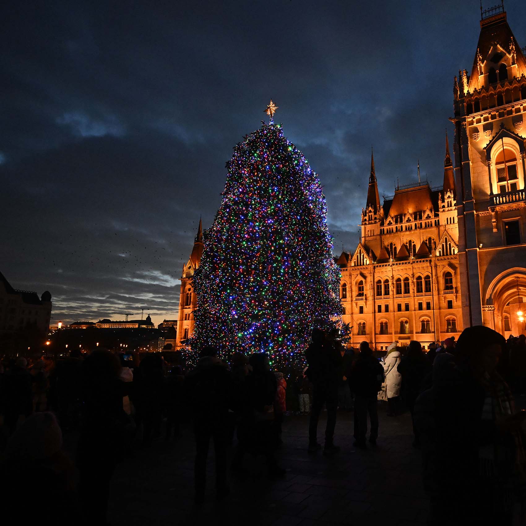 Az Országház előtt felállított, a nyírségi Ibrány városából érkezett csaknem 23 méteres ezüstfenyő a több napig tartó díszítést követően advent első vasárnapjának délutánján nyerte el teljes pompáját.