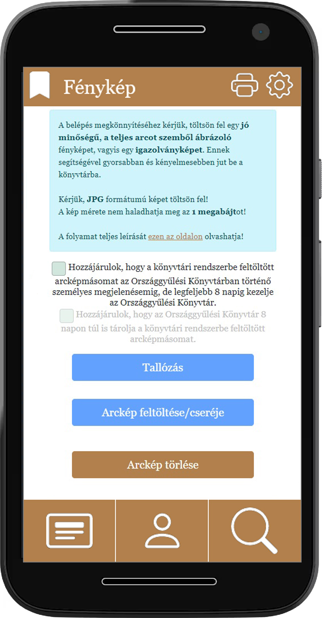 FONTOS! Az önkéntes arcképfeltöltés esetén az Országgyűlés Hivatala jogszabály alapján jogosult az arckép beléptetéshez történő felhasználására, nyilvántartására. Amennyiben a könyvtár olvasói adatbázisában és az olvasói fiókban is szeretné arcképe nyilvántartását és megjelenítését, kérjük, nyilatkozzon a feltöltéskor ehhez való hozzájárulásáról, ennek hiányában az e-olvasójegyből – az elektronikus beléptető rendszerrel történt adatszinkronizálást követően – a rendszer az arcképet automatikusan törli. Az e-olvasójegyből ön bármikor törölheti az arcképét, ez azonban nincs kihatással az elektronikus beléptető rendszerbe került arckép további kezelésére.