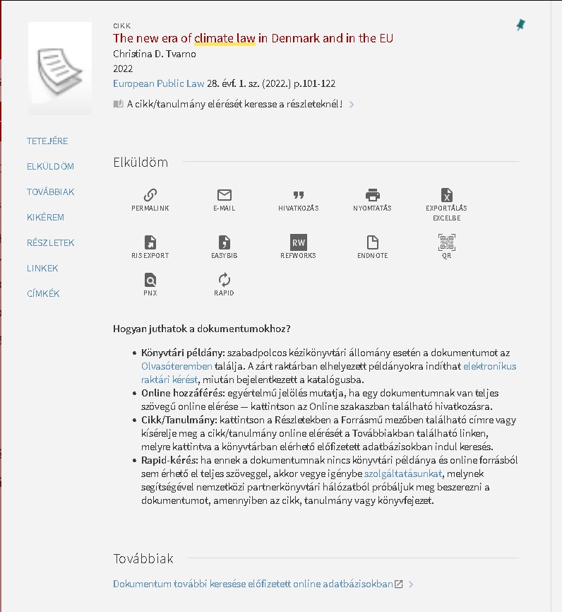 Szükség van a katalógusban talált tétel permalinkjére. Ennek elküldéséhez elegendő a tétel részletes nézetében az Elküldöm szakaszban a "RAPID" műveleti gombra klikkelni: